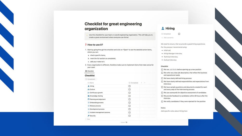 You'll get access to Notion Template: Checklist for Great Engineering Organization to duplicate it into your own workspace.